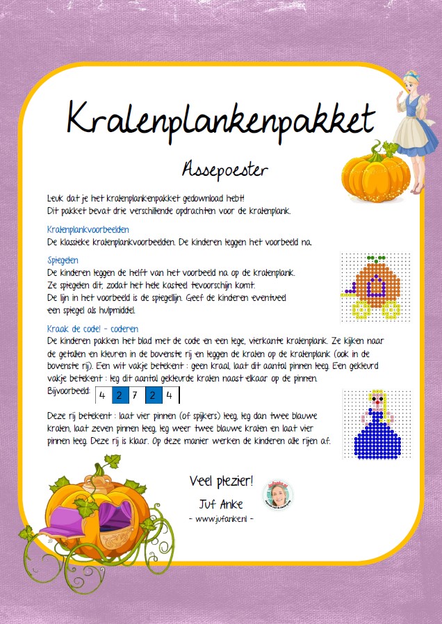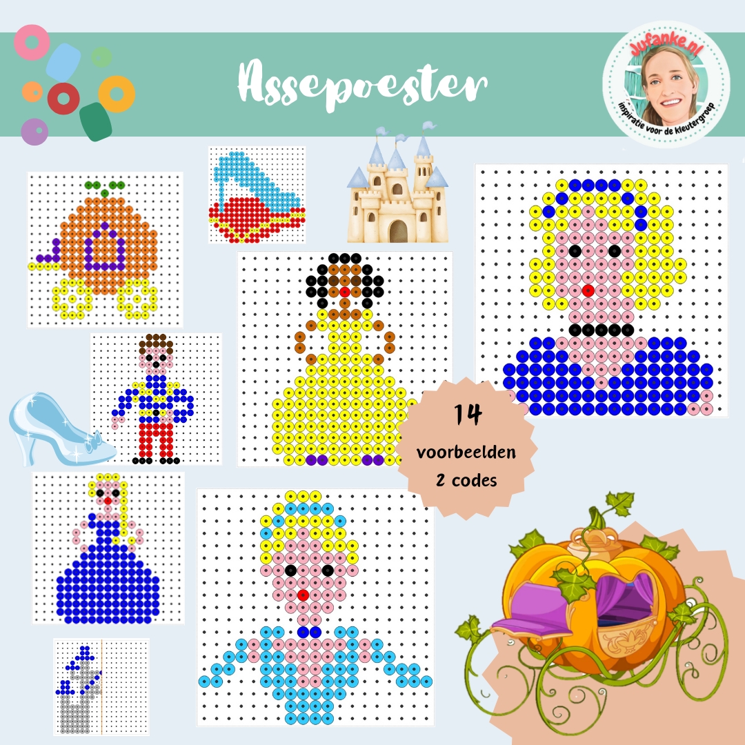 16 opdrachten voor de kralenplank bij het thema ‘sprookjes – Assepoester’. De download bevat klassieke kralenplankvoorbeelden, een opdracht waarbij de kinderen het spiegelen oefenen en een programmeeropdracht (kraak de code!).
