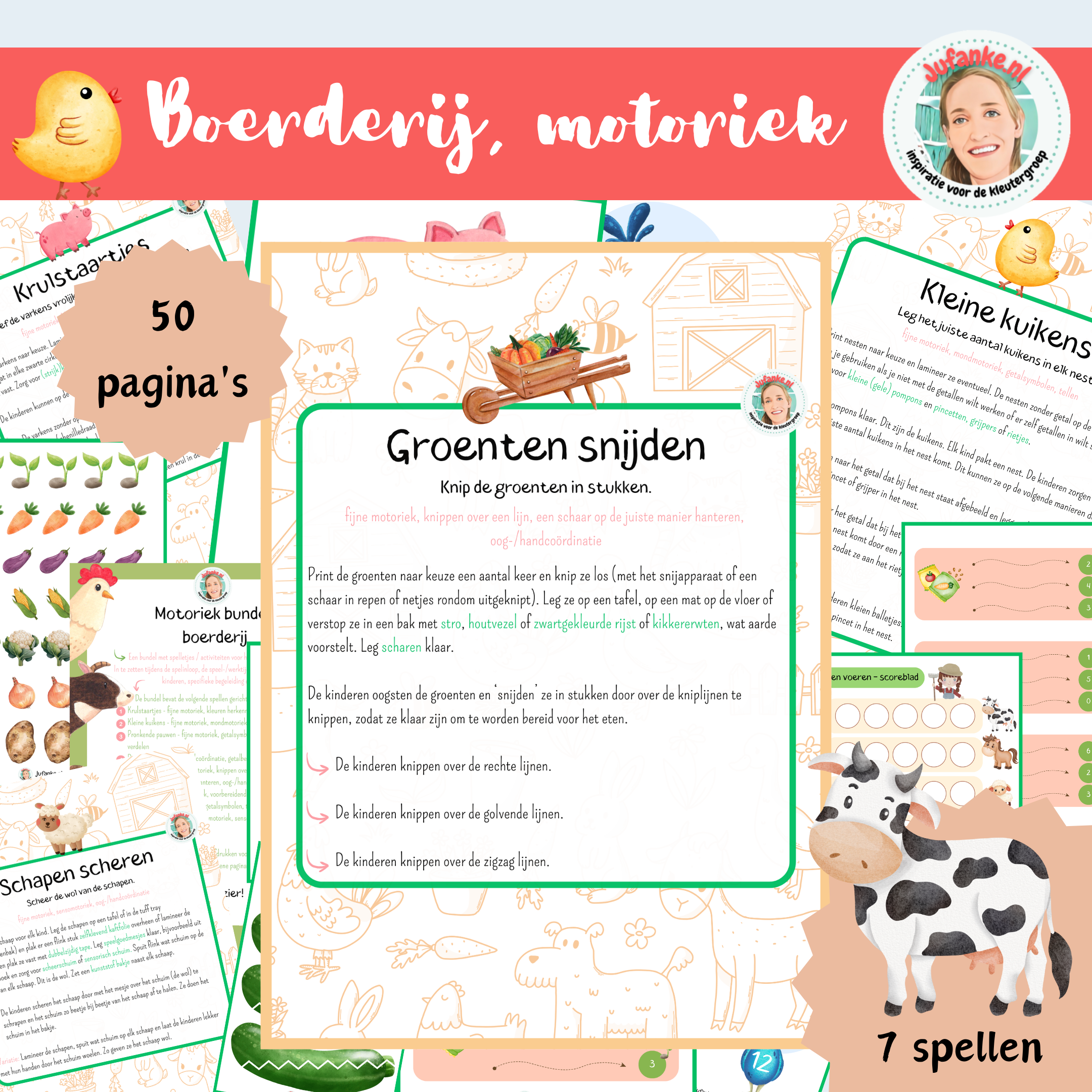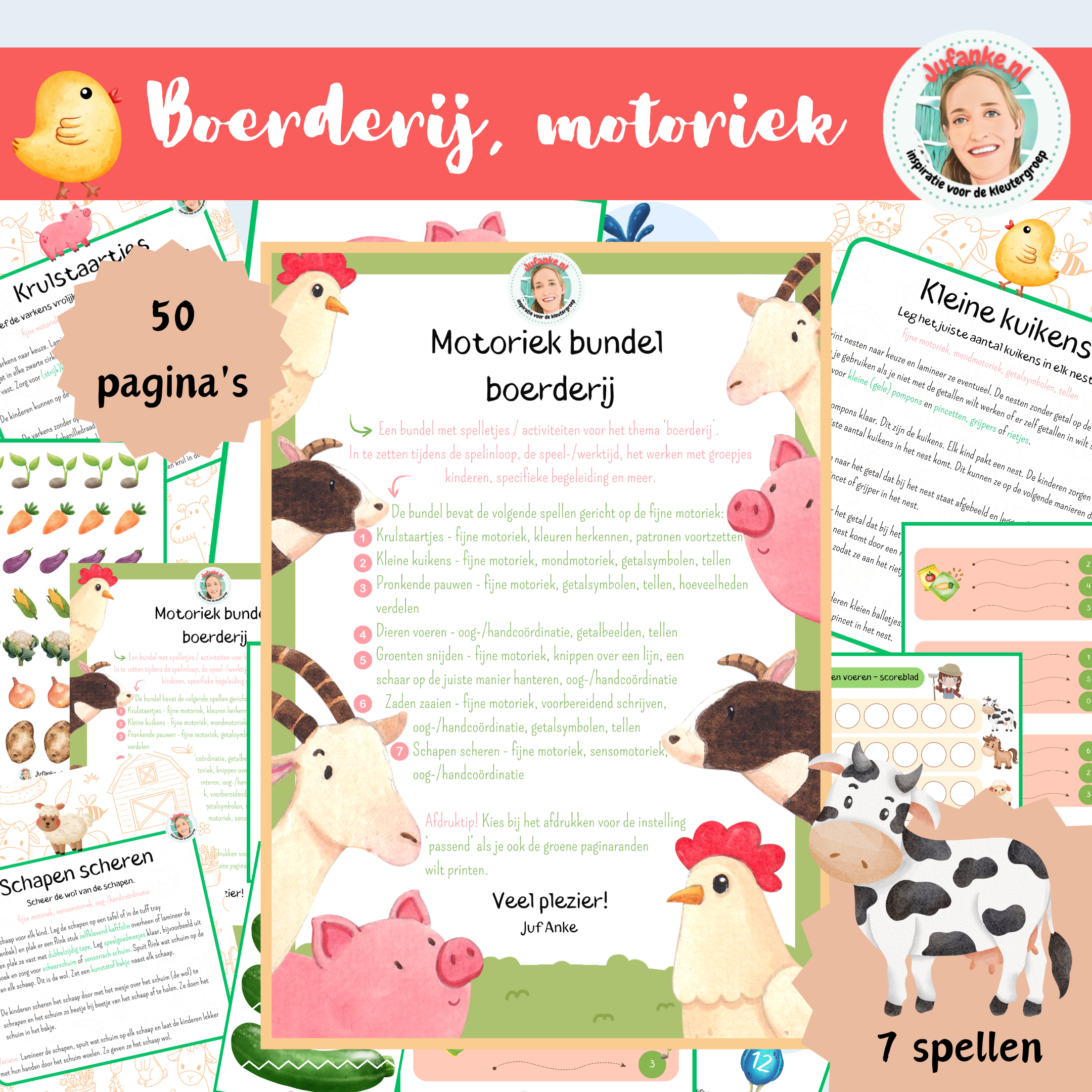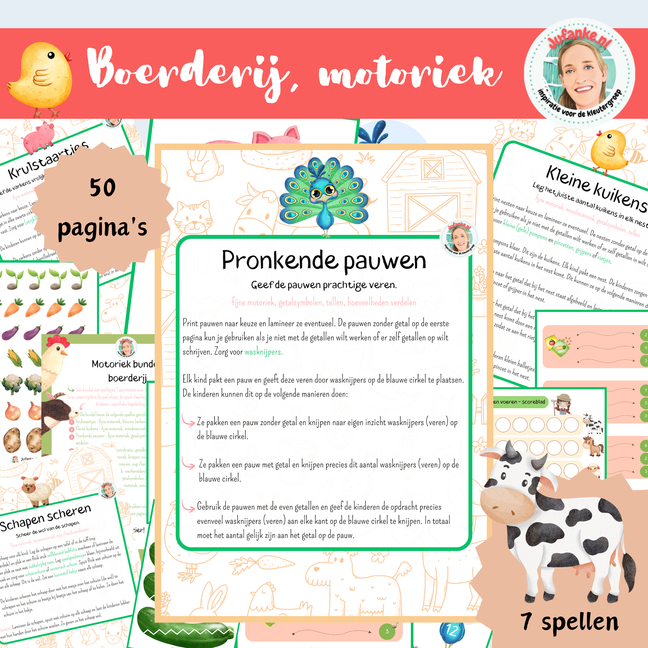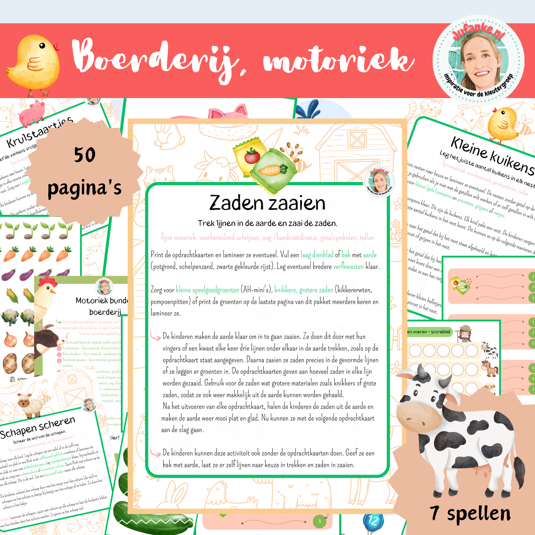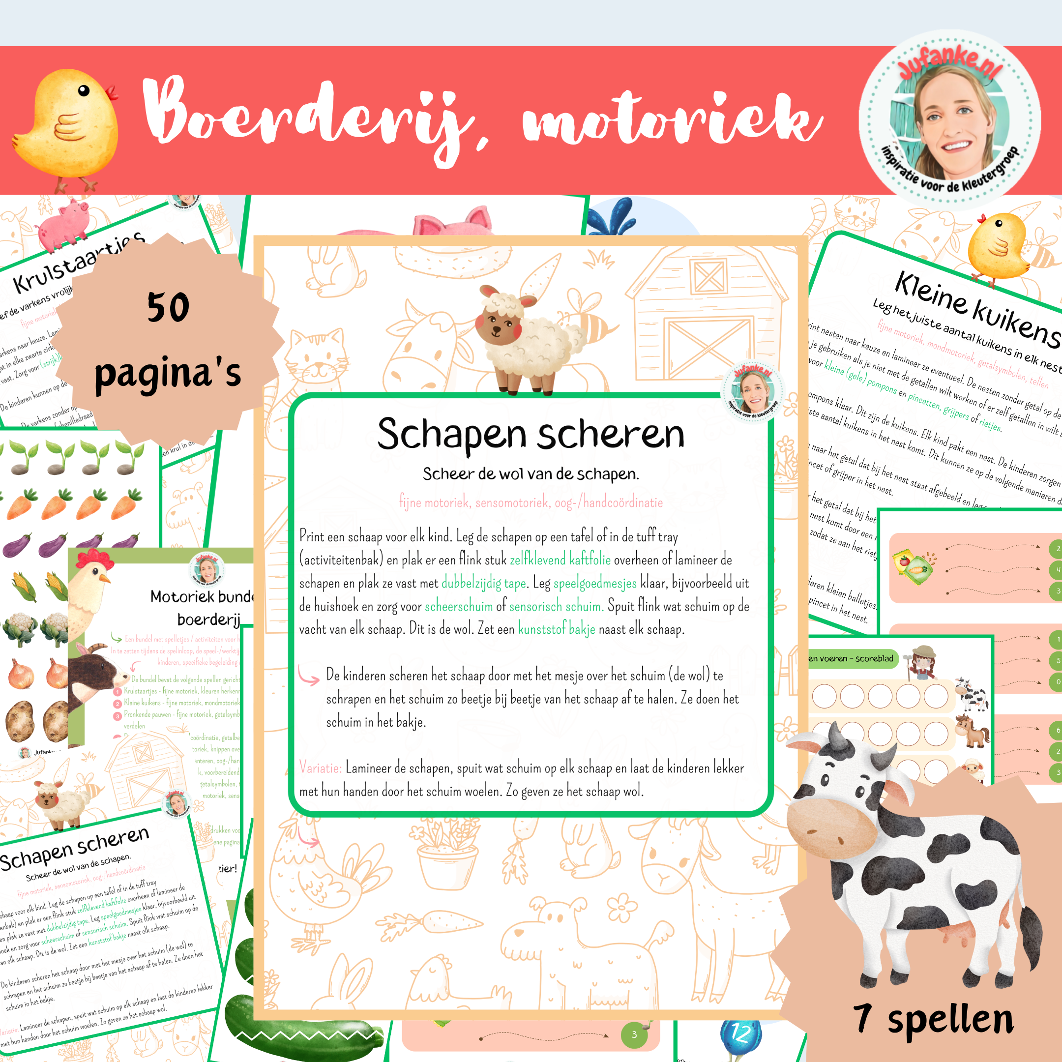 Deze digitale download van 50 pagina’s bevat 7 activiteiten / spellen in het thema boerderij gericht op de fijne motoriek. Daarnaast worden ook andere doelen, voornamelijk rekendoelen, aangetikt. De spellen zijn in te zetten tijdens de spelinloop, de speel-/werktijd, het werken met groepjes kinderen, specifieke begeleiding en meer.