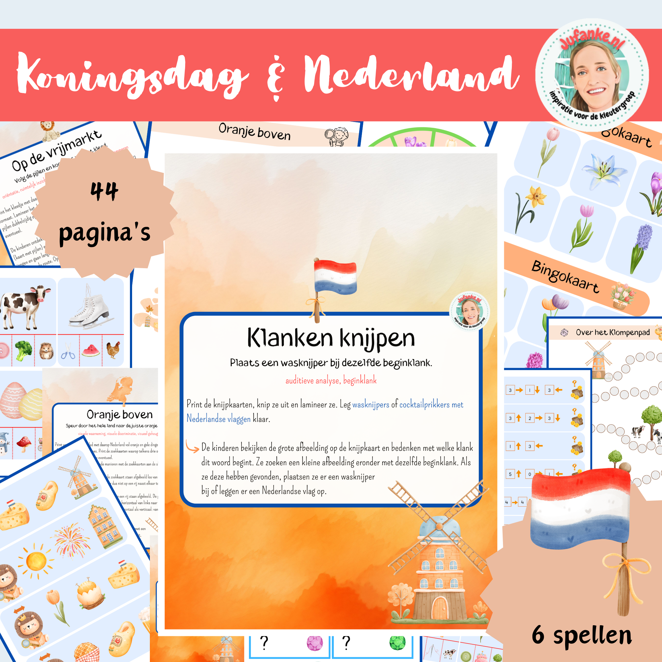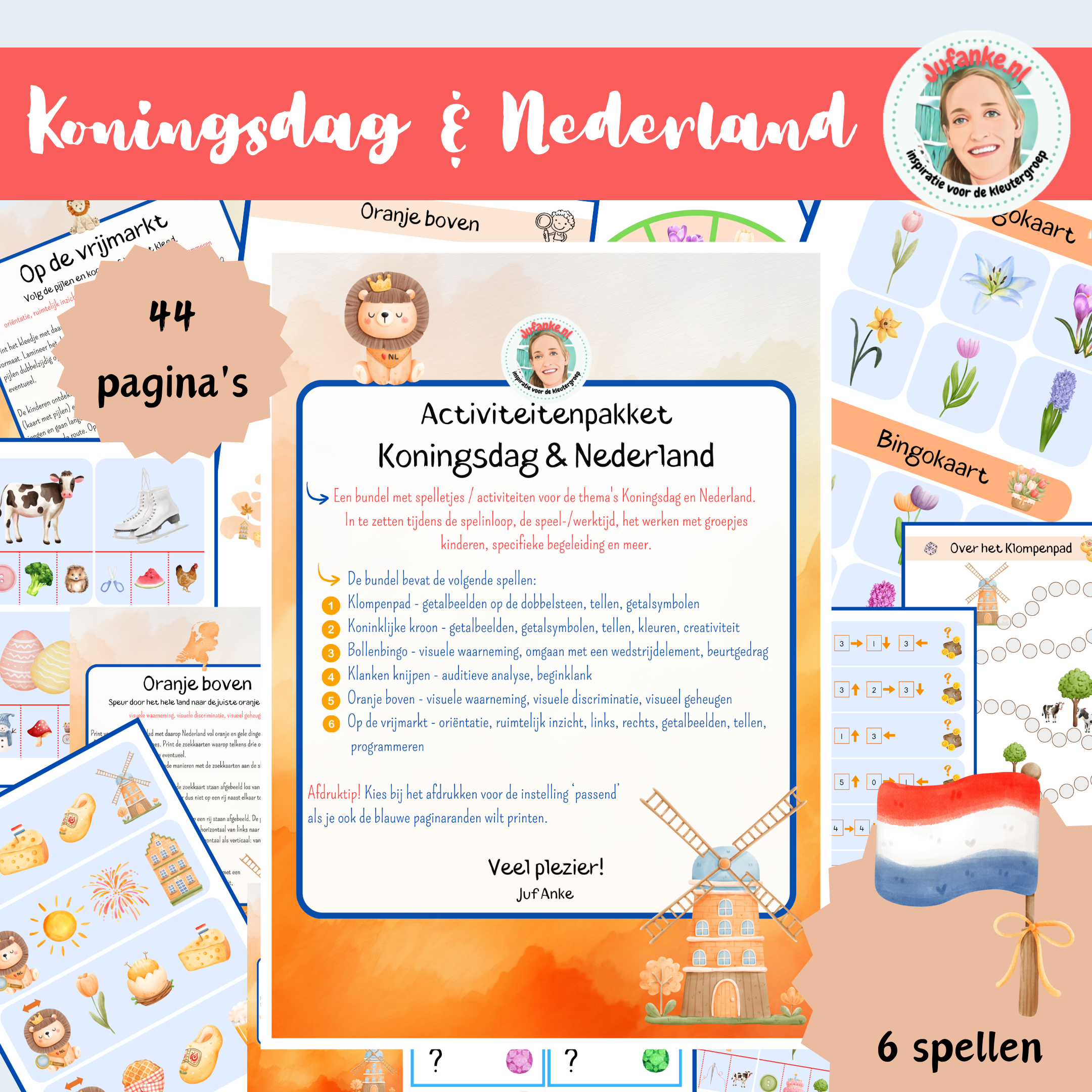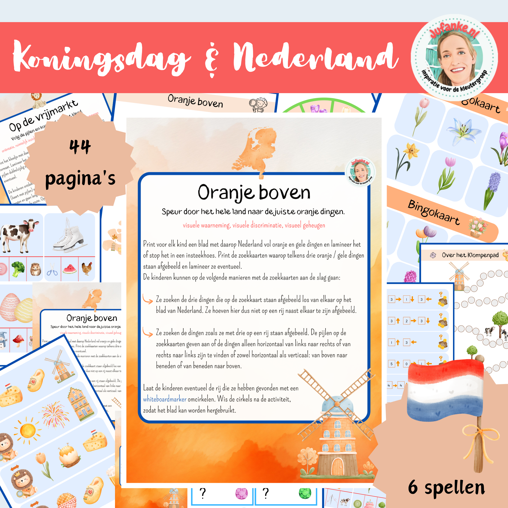 Deze digitale download van 44 pagina’s bevat 6 activiteiten / spellen in de thema’s Koningsdag en Nederland om in te zetten tijdens de spelinloop, de speel-/werktijd, het werken met groepjes kinderen, specifieke begeleiding en meer.