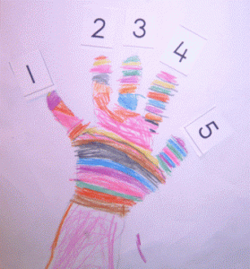 Laat de kinderen een handafdruk maken met verf. Een voetafdruk kan ook! Het is ook leuk om een hand onder het kopieerapparaat te leggen en er een kopie van te maken.