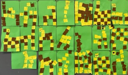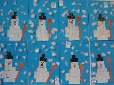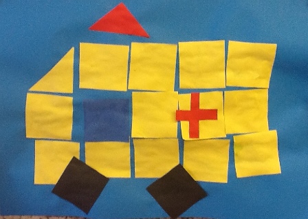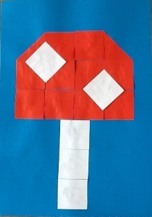 Blokjeswerkjes kun je laten maken met kant-en-klare vierkante plakfiguren. Ik laat mijn oudste kleuters deze vierkanten altijd zelf maken, door een paar verschillende kleuren vouwbladen in 16 vierkantjes te laten vouwen en deze allemaal los te laten knippen.